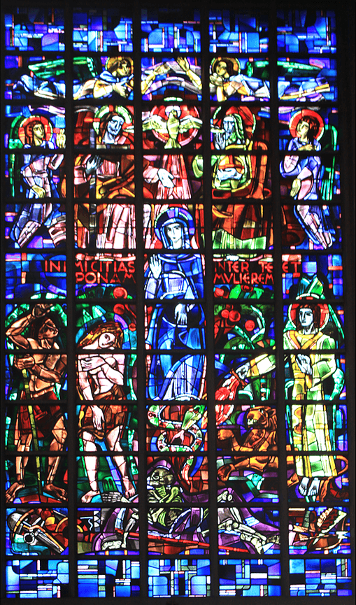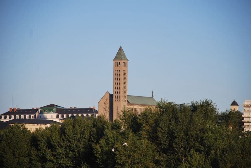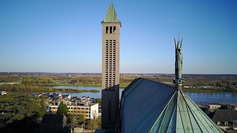 Bâtie avec le gravier de la Loire, sa rudesse extérieure est contre-balancée par les couleurs chatoyantes qui se dégagent des 14 immenses verrières et de la majestueuse mosaïque du chœur. L’édifice est à l’image de celle à qui elle rend honneur : d’une grande douceur.