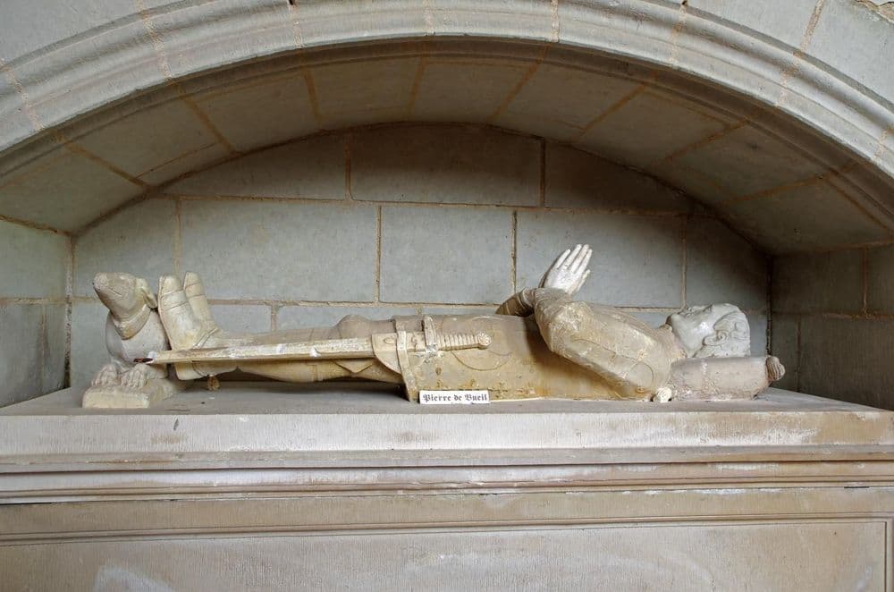 Gisants de membres de la famille de Bueil exposés dans des en-feux, baptistère recouvert d'une dube en bois sculpté du 16ème siècle, peinture murale restaurée récemment.