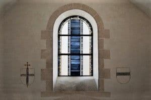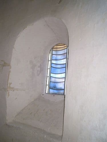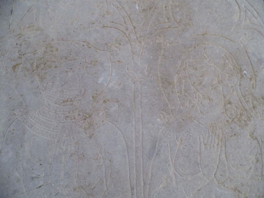 On peut y admirer douze grandes pierres tombales gravées, des XIIIe et XIVe, redressées et fixées au mur, et des vitraux contemporains