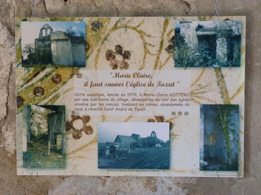 Elle fut utilisée comme bâtiment agricole jusqu’à la fin des années 1950. Abandonnée, elle tombe en ruine avec ses toitures effondrées ou envahies par la végétation. En 1981, les Amis du Vieux Taxat décident de relever le défi de sa restauration : 1995 toitures du chœur et du transept, 2012 clocher et toitures de la nef, 2015 sauvetage de la façade, 2021 consolidation des maçonneries du chœur avant la restauration des peintures.