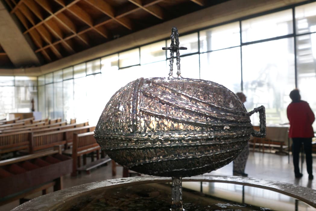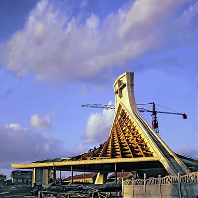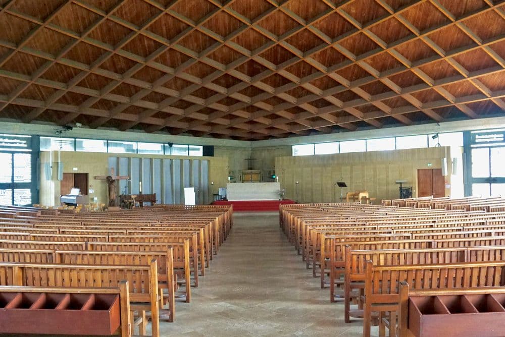 L'architecte, Anton Korady, a dessiné une belle toiture suspendue à un puissant arc en béton qui soutient tout l'édifice. Les deux pans du toit suivent une courbe élégante et évoquent à la fois des mains jointes et les voiles d'un navire. Il n'y a pas de murs dans cette église.