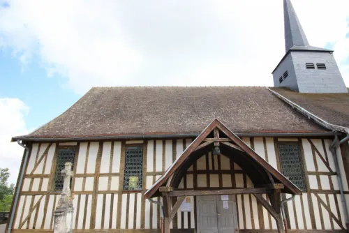 Voici l'aspect qu'avait cette église du XVe siècle à pans de bois : elle a entièrement brûlé, et va être reconstruite à l'identique.