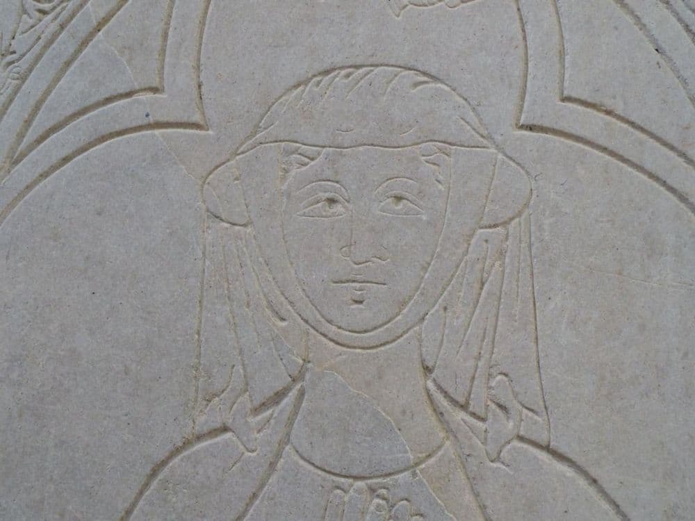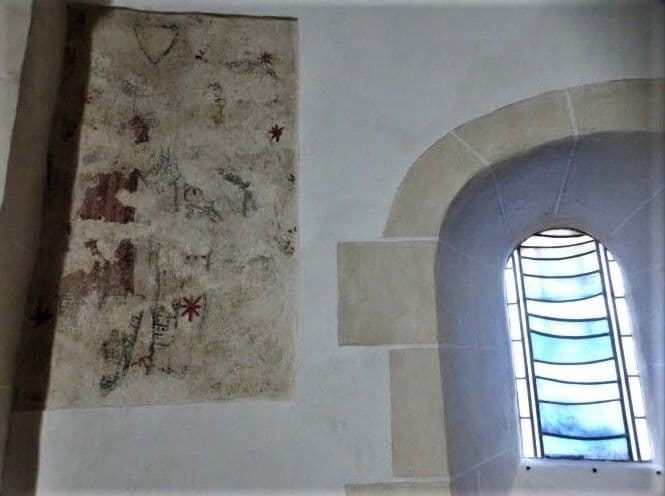 On peut y admirer douze grandes pierres tombales gravées, des XIIIe et XIVe, redressées et fixées au mur, et des vitraux contemporains