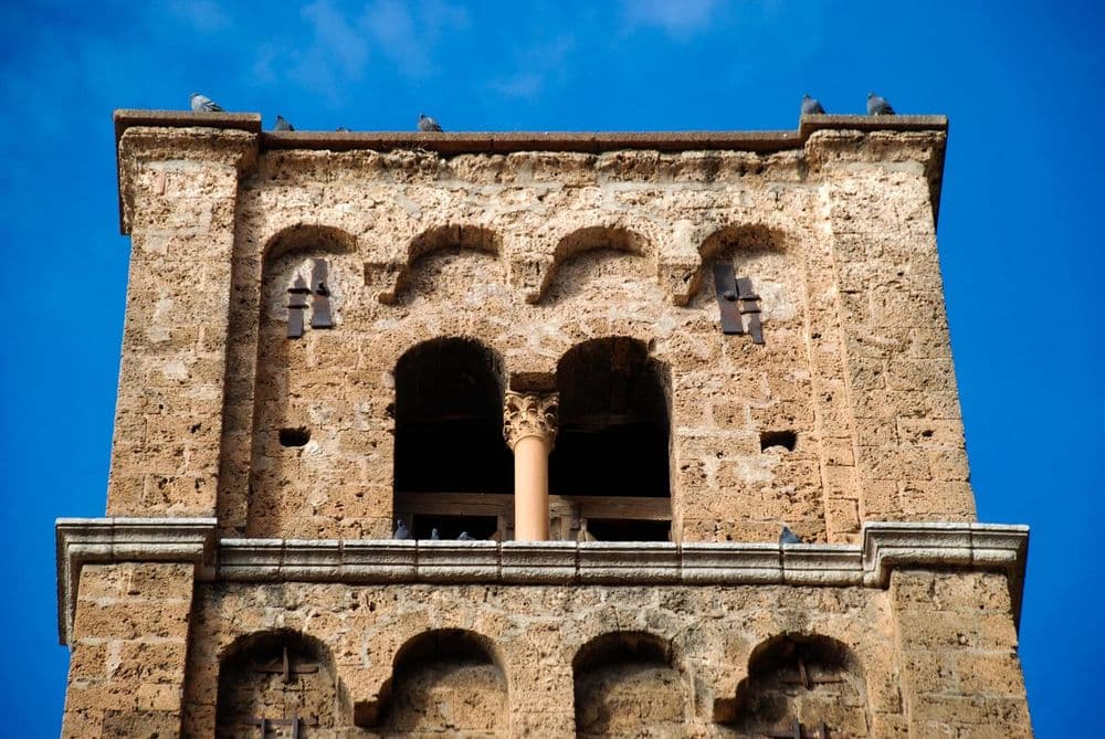 Son clocher lombard de 1447 avait la particularité de bouger en même temps que les cloches. C’est une tour carrée haute de 22 m à quatre étages de baies romanes.